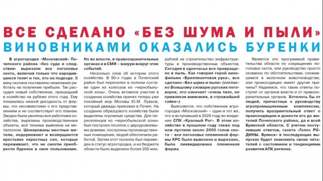 Приводятся шокирующие данные о том, что в указанных хозяйствах в одночасье все превращено в пыль: под нож пустили все поголовье скота, ликвидирована племенная ферма, уволены все работники предприятий, вырезаны производственные объекты, вся техника вывезена на металлолом. Но во власти, в правоохранительных органах и в СМИ Брянской области - вакуум вокруг этих событий. Чтобы получить вразумительный ответ о происходящем, газета «Голос РОДИНЫ. Брянск» обращается к руководству АПК Брянской области. С учетом поступивших ответов, в последующих выпусках газета будет знакомить своих читателей с состоянием и тенденциями развития сельского хозяйства региона.