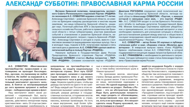 На второй полосе публикуются новая статья ветерана брянской политики, председатель экспертного Совета Регионального отделения Партии "РОДИНА" по экономике А.С. СУББОТИНА. Александр Сергеевич - автор более 30 научных и публицистических работ и книг, сборника стихов «Молитва духа ветерана». В январском выпуске газета «Голос РОДИНЫ. Брянск» опубликовала статью А.С. СУББОТИНА, в которой поддерживается концепция лидера патриотов Брянской области В.Г. ГРИНКЕВИЧА о необходимости деятельного патриотизма.