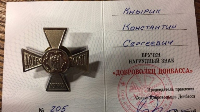 Вчера, 18 марта, Крестом «Доброволец Донбасса» был отмечен руководитель Крымской республиканской организации всероссийской партии "Родина" и информационного агентства News Front Константин Кнырик.