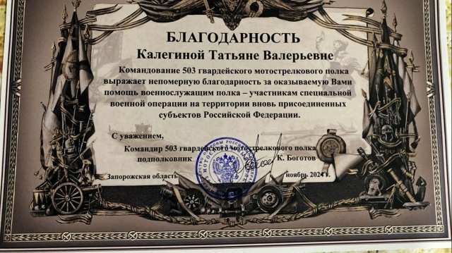 • Татьяна Калегина получила благодарность от командования 503-го гвардейского мотострелкового полка