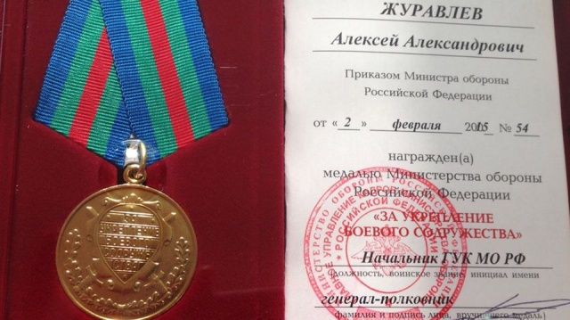 • Журавлёв награждён медалью "За укрепление боевого содружества"