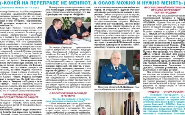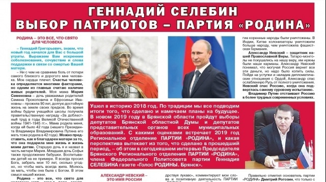 Январский выпуск газеты публикует большое интервью с председателем Брянской "РОДИНЫ", членом Политического Совета партии Геннадием Селебиным "Выбор патриотов - партия "РОДИНА". Данное интервью получило большой общественный резонанс после публикации в интернет-издании "Новости Брянска" КОНЕЙ НА ПЕРЕПРАВЕ НЕ МЕНЯЮТ, А ОСЛОВ МОЖНО И НУЖНО МЕНЯТЬ (ЧТОБЫ ПОЛИТИЧЕСКАЯ БОРЬБА НЕ СТАЛА ВОЙНОЙ).